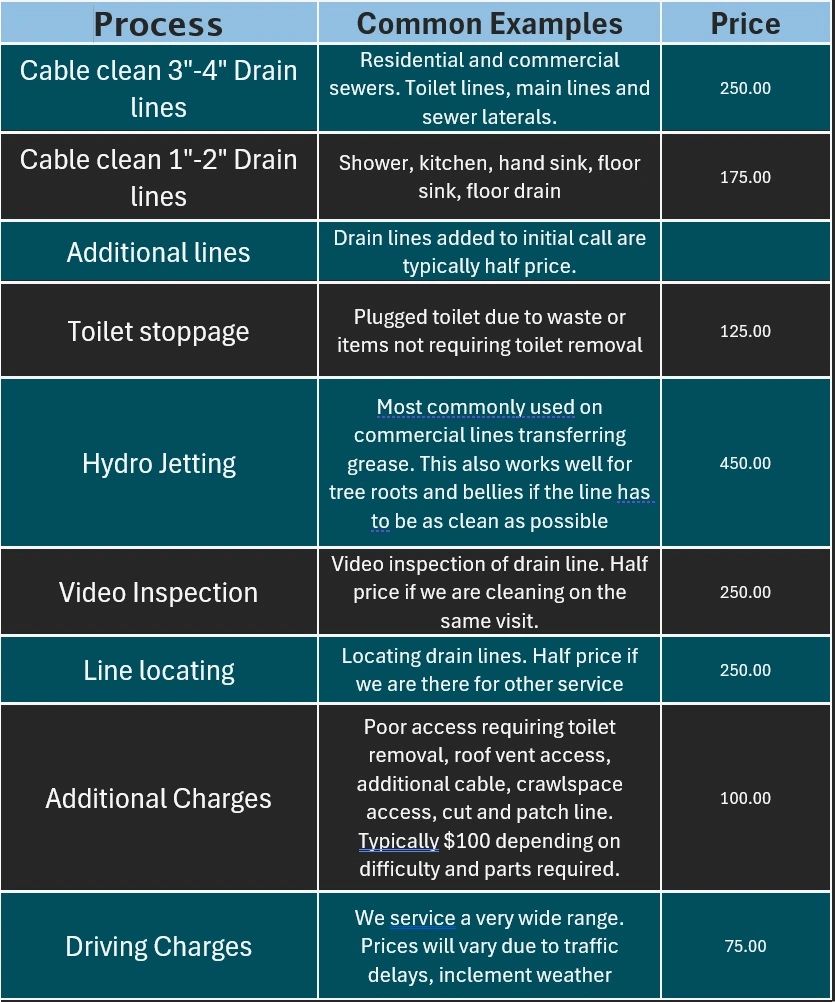 Pricing is contingent upon adequate and safe access to the line. If the line is collapsed, severely damaged, not up to code, or otherwise inaccessible, services may be modified, discontinued, or subject to addtional charges.
